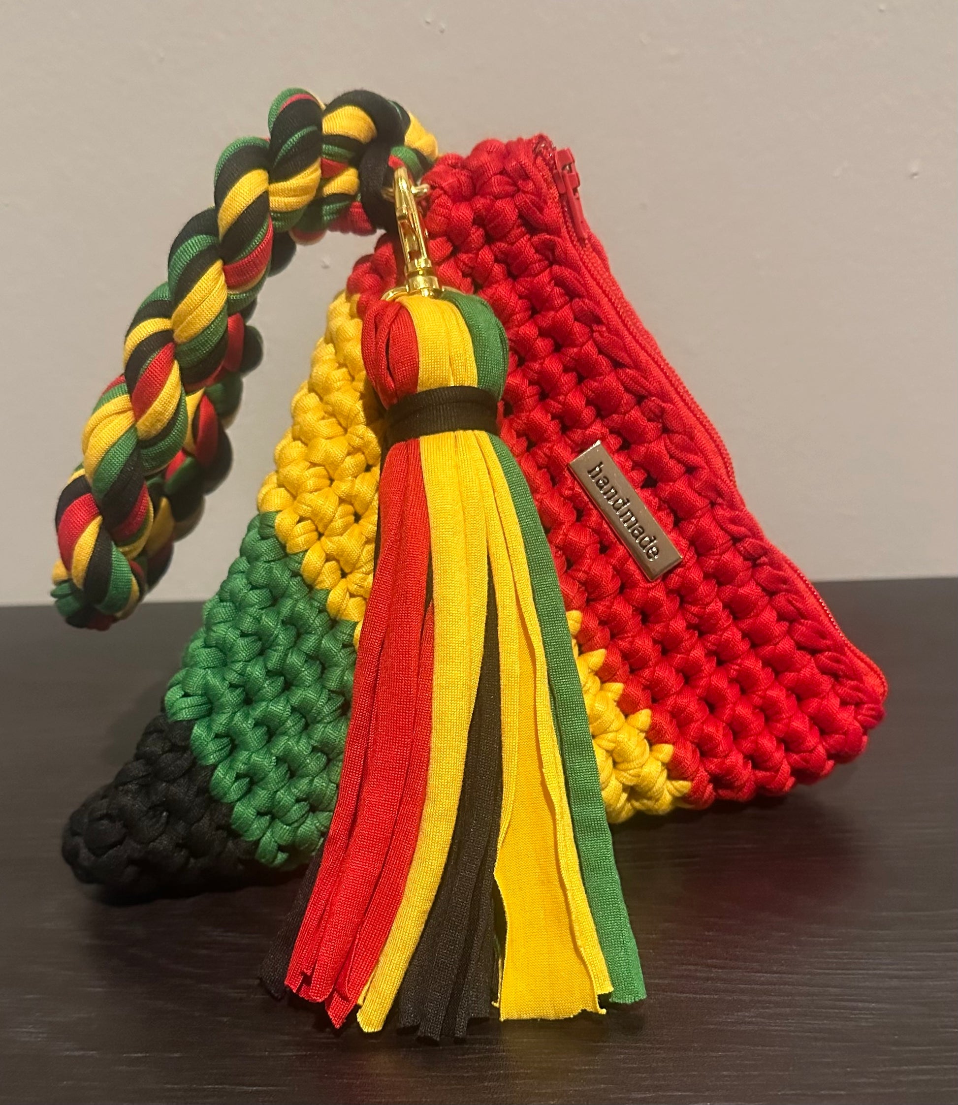A pyramid shaped bag made with 4 different colors of T-shirt yarn.